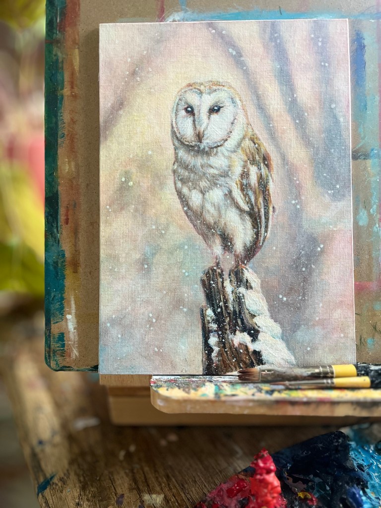 Sometimes the idea comes before the reference. In the case of the barn owl painting below, it started with an idea for a wintery picture, with that diffuse glowing light you can get on a snowy day, and how that would work with the softness of the owls feathers. Then I found the reference picture of a barn owl that would work with this. In the picture I found (a beautiful photograph on Unsplash by Bruno van der Kraan) the owl was actually standing on some lush green grass, so I found a number of other pictures I could refer to when creating the snowy background, the old branch and the light.